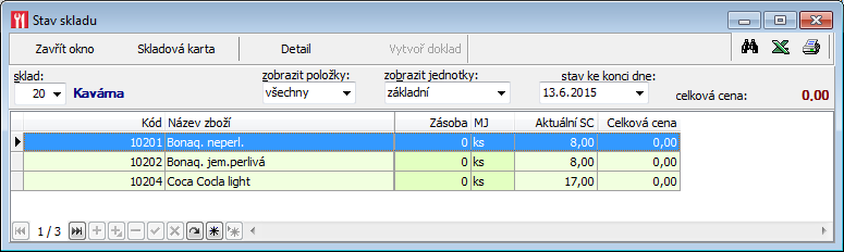 | Detail | Detail stavu skladů zobrazí stav položky v jednotlivých skladech. |