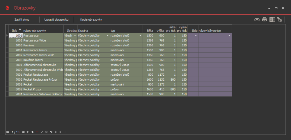 Po zvolení nabídky Obrazovky se zobrazí okno s číselníkem obrazovek – zde lze založit novou obrazovku pomocí klávesy Insert.