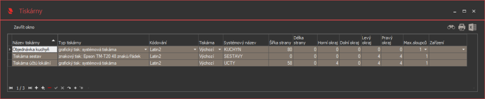 V číselníku Tiskáren se definují všechny tiskárny v systému SmartPOS. Na ně se pak odkazují definice tiskárny účtů a tiskárny sestav každého pokladního terminálu a také tabulka zdrojů určuje, na které objednávkové tiskárně se pro dané zboží vytiskne objednávkový bon.