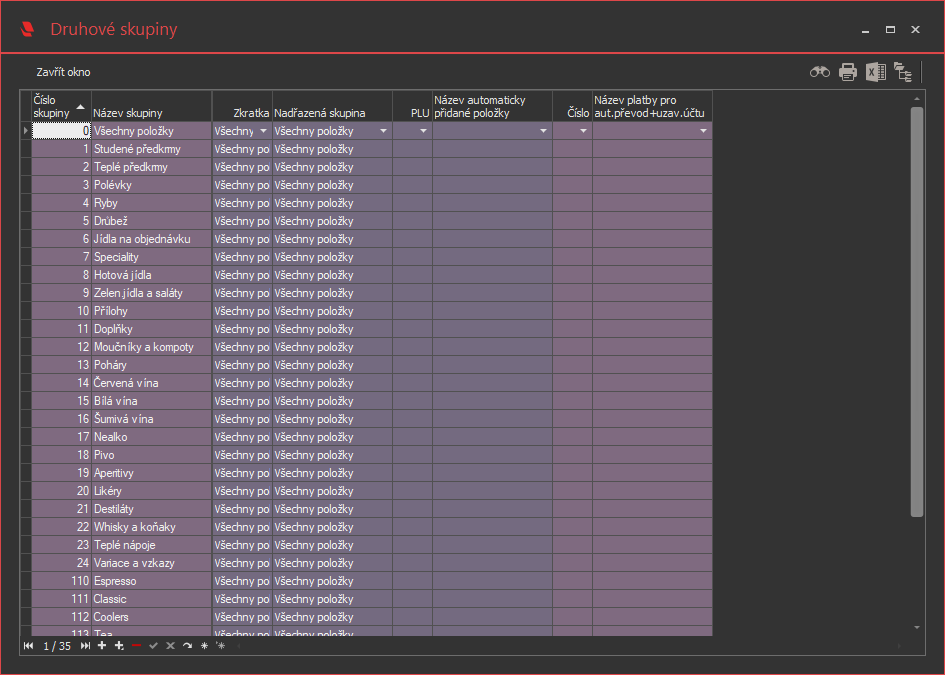 Druhové skupiny slouží pro detailní sledování a rozbory druhových sestav a statistik. Jsou přiřazeny jednotlivým druhovým variantám a mají vliv pouze na jejich seskupování v druhových výstupech. (Kód zboží ve Zboží)