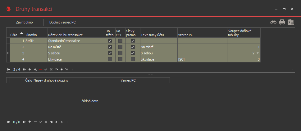 Číselník s druhy transakcí slouží především pro odlišení transakcí s různou hodnotou DPH (konzumace na místě, prodej s sebou, likvidace). Transakce lze také rozlišovat podle tvorby prodejní ceny.