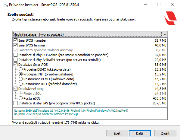 Instalátor automaticky detekuje, zda je již na počítači nainstalován databázový stroj Firebird SQL a podle toho zpřístupní volbu pro jeho instalaci.