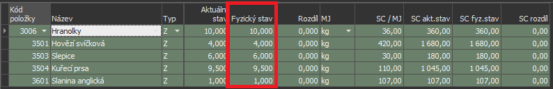 (Vidíme zde také kolonku rozdíl, ta nám udává cenový rozdíl množství zboží na skladě.)