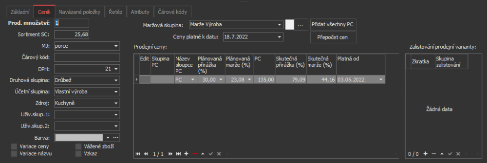 | Maržová skupina | Výběr z číselníku maržových skupin – podle ní lze poté automaticky vypočítat prodejní cenu. |