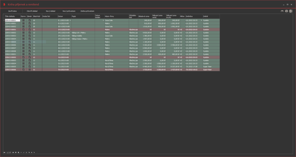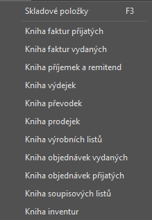 Kniha dokladů funguje stejně, jako číselník skladových dokladů, ale nachází se v něm pouze položky, které odpovídají názvu knihy.