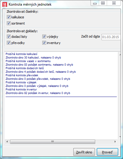 Funkce Kontrola měrných jednotek projde uzamčené skladové doklady od zadaného data a kontroluje, zda měrné jednotky na nich uvedené jsou převoditelné na základní jednotku.