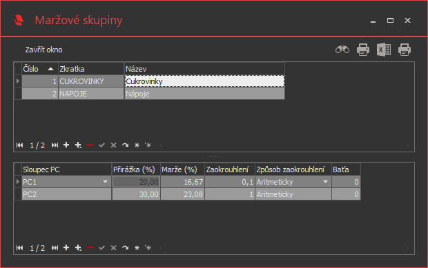 Maržové skupiny se používají pro výpočet prodejní ceny (sloupce PC1, PC2…) ze základní skladové ceny.