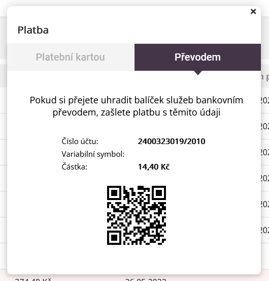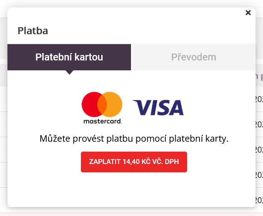 Faktury lze uhradit kliknutím na tlačítko zaplatit. Poté vyberte, jestli chcete zaplatit kartou nebo bankovním převodem.