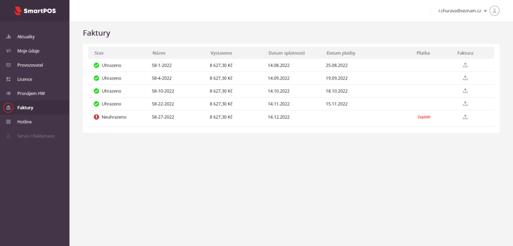 Na stránce Faktury vidíte všechny Vaše faktury a stav jejich zaplacení.