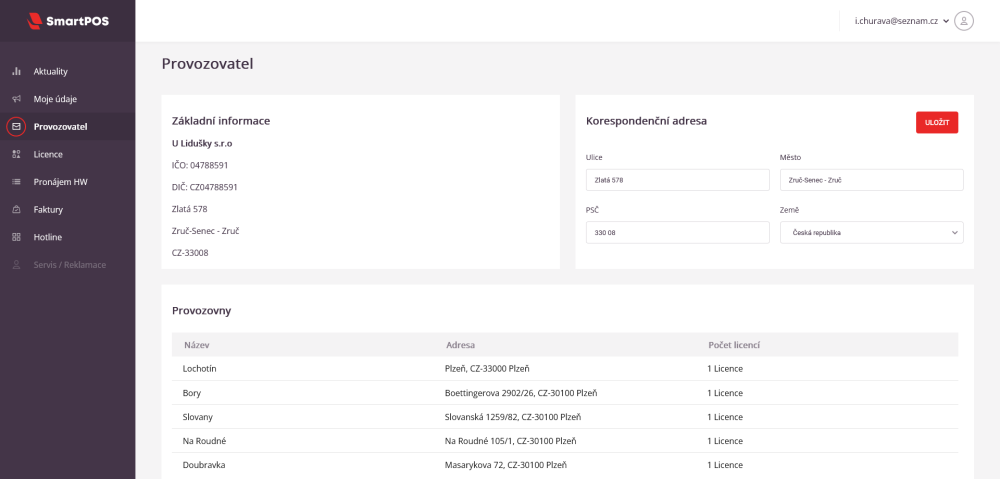 Na stránce Provozovatel vidíte údaje o Vaší firmě. Dále si zde můžete upravit korespondenční adresu.
