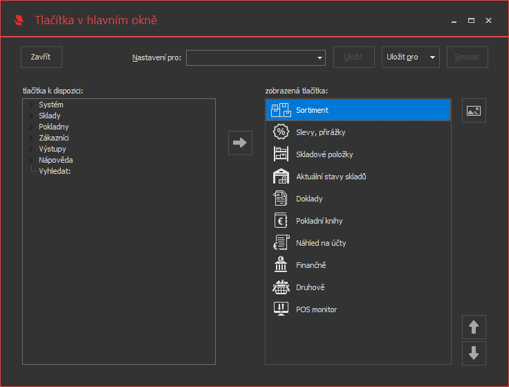 Pomocí tohoto prvku lze nastavit hlavní položky SmartPOS manažeru, přidávat, odebírat a měnit jejich pořadí. Manažer je nastaven na 10 položek. Zobrazená tlačítka nelze odebírat, pouze přepisovat přidáním z prvku umístěných v části Funkce k dispozici.