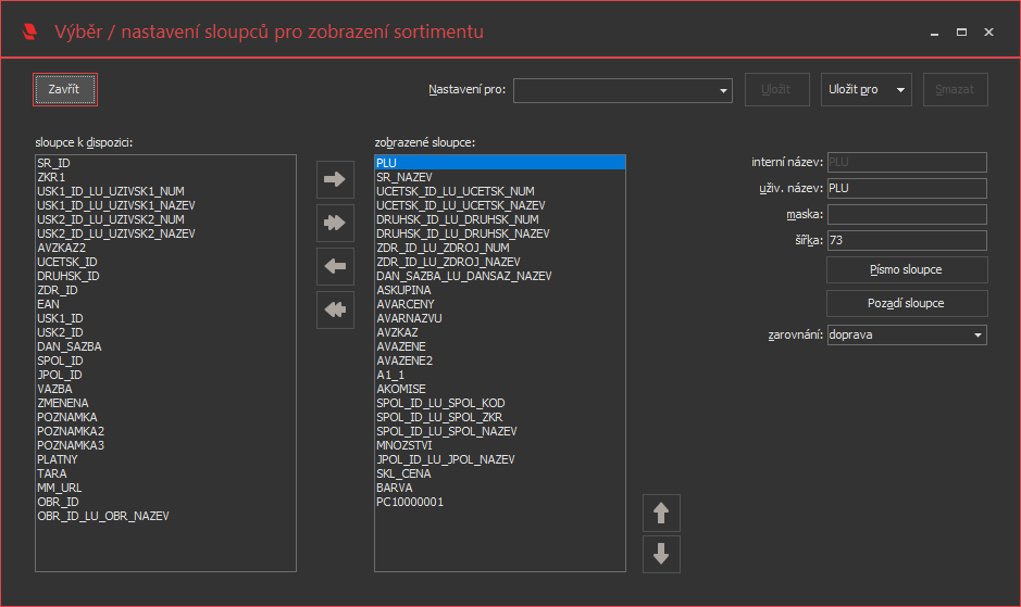 V tomto okně může uživatel definovat, které sloupce v tabulce uvidí. Může také pro jednotlivé sloupce definovat vlastní název, zarovnání, masku a šířku sloupce. Dále lze definovat i barvy a font. Pomocí tlačítek šipka nahoru a šipka dolů lze jednotlivé sloupce v tabulce posunovat doleva a doprava.