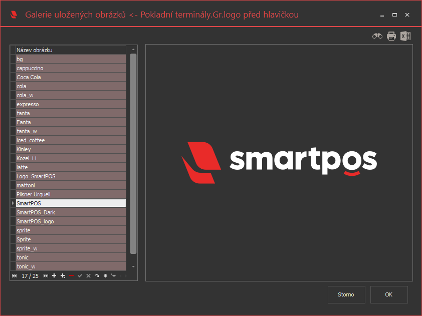 Pro tisk účtu v grafickém režimu se bitmapy přiřazují do sloupců Logo před hlavičkou, Logo za hlavičkou, Logo před patičkou, Logo za patičkou. Po stisku mezerníku nebo dvojkliku v příslušné buňce se objeví dialog pro načtení/výběr obrázku. Tento obrázek se pak tiskne v grafickém účtu na příslušném místě (před/za hlavičkou, před/za patičkou účtu). SmartPOS jej vždy zúží/roztáhne na celou šířku účtu (mínus definované okraje) – při zachování poměru stran původního obrázku, takže pokud chceme logo menší než na celou šířku, uložíme jej do původního obrázku i s příslušnými okraji. Velikost bitmapy není omezena, ale jelikož se přenáší do tiskárny pro každý účet znovu, je vhodné u velkých souborů zmenšit rozlišení na šířku max. 800 pixelů.