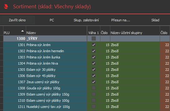 U vážených položek je třeba v tabulce Sortiment zaškrtnout parametry položky Váha 1 nebo Váha 2. Nejsou-li tyto sloupce zobrazeny, zviditelníme je pomocí kombinace kláves Ctrl+F9.