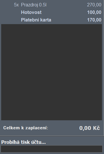 Platby na účtech je samozřejmě možné libovolně kombinovat. Stačí do řádku pro markování vepsat hodnotu (pomocí numerických tlačítek) a stisknout klávesu s příslušnou platbou, např. “100“ a Hotovost. Na účet se přidá položka “Hotovost 100 Kč” a suma celkem k zaplacení o tuto částku klesne. Doplatek zbytku účtu se již provede automaticky po stisknutí další platby.
