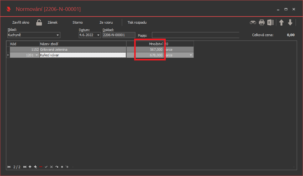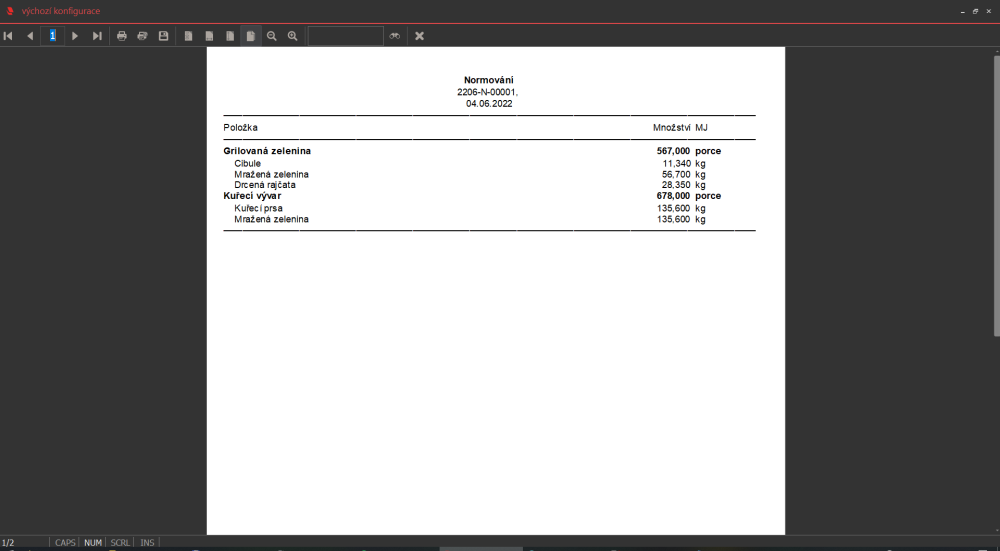 Nyní můžeme tlačítkem tisk rozpadu na horní liště zobrazit (a následně vytisknout) rozpočítané množství zboží.