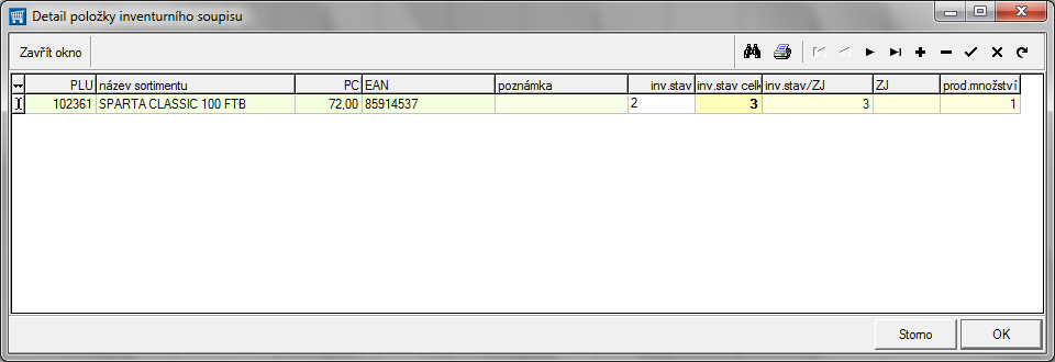 Po vložení čtečkou nebo při změně existujícího záznamu soupisu (Enter v hlavním okně) se nastaví kursor na zelené pole Inv. stav, kam můžeme opakovaně zadávat nalezené množství položky při inventuře – to se vždy přičte do celkového inv. stavu (ve žlutém poli). Nebo můžeme celkový stav rovnou ve žlutém poli přepsat. Při vkládání stavu stačí po vložení číselné hodnoty stisknout dvakrát Enter pro zapsání této hodnoty do buňky a potvrzení detailního okna položky soupisu.