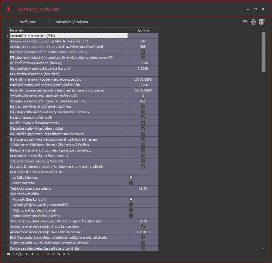 Parametry systému lze nastavit v okně Parametry systému. Parametry ovlivňují chod celého systému a je doporučeno jejich nastavení konzultovat s Vaším dodavatelem SmartPOS. Podrobný popis systémových parametrů je uveden v Technické příručce k systému SmartPOS.