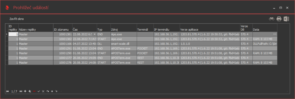 Jde o výpis událostí na jednotlivých terminálech – zpravidla referuje o spuštění a ukončení činnosti spustitelných .exe souborů. Dává informace o čase, verzi aplikace, verzi databáze a základní informaci o hardwaru. Kromě informace o spuštění a ukončení umí zaznamenat i nestandardní chování aplikace, které většinou naznačuje nějakou chybu.