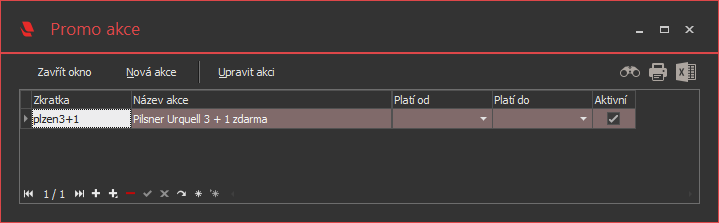 | Aktivní | Zatržený příznak určuje, že má být promo akce použita při markování. Pozn.: Aby byla akce platná, musí být současně splněny podmínky trvání akce v daném časovém období. |