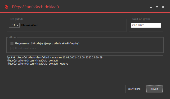 - V případě klouzavých cen dojde k chronologickému přepočtu cen na dokladech. Na závěr přepočtu jsou vypsány skladové karty se záporným stavem (pokud byly nalezeny).