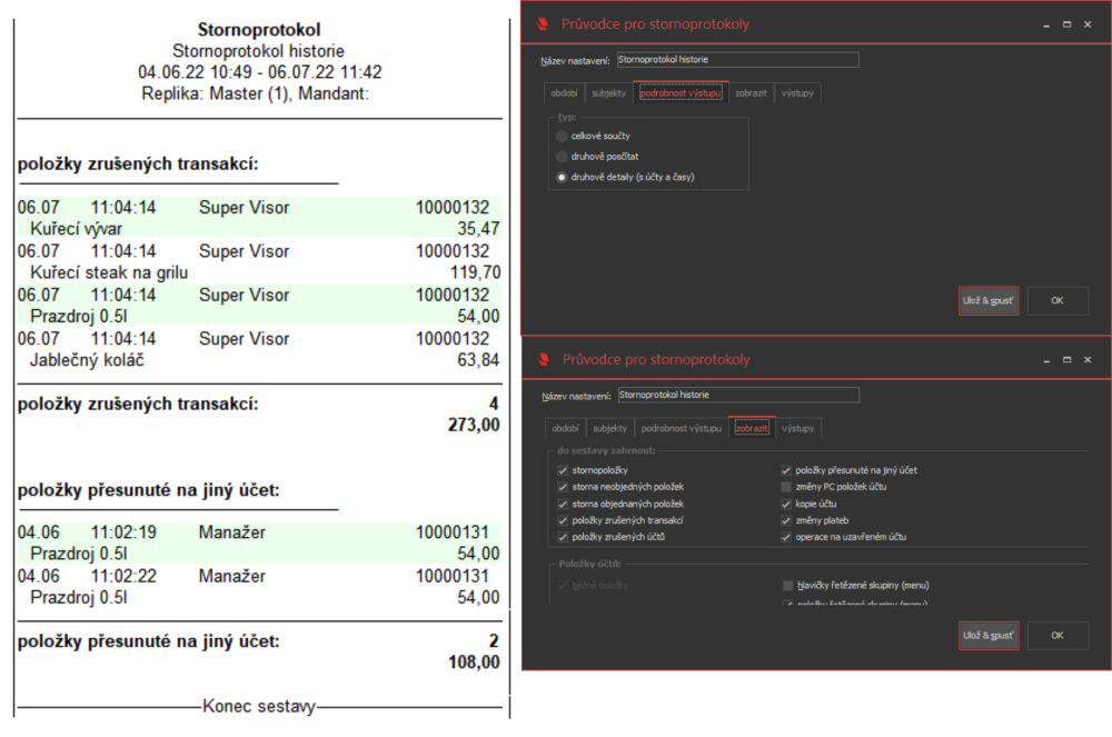Sestava Stornoprotokol slouží pro kontrolu stornovaných transakcí. Používá se zpravidla ve dvou variantách – buď zobrazuje smazané položky a storno položky na platných účtenkách, nebo zrušené účty.