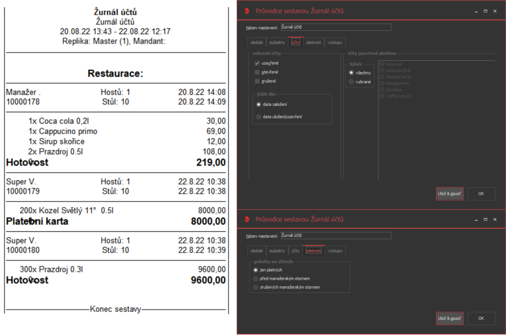 Tuto sestavu lze použít pro kompletní výpis namarkovaných účtů včetně všech položek a plateb v aktuálním nebo vybraných intervalech. Protože tato sestava je obvykle velmi dlouhá a pouze rekapituluje údaje na vydaných účtenkách, používá se obvykle pouze jako náhled na obrazovce. Lze jí také použít pro zobrazení otevřených účtů pro danou pokladnu/terminál.