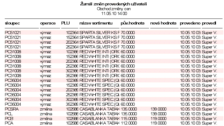 Sestavu lze použít pouze v případě, že je systém SmartPOS konfigurován pro sledování změn v sortimentu. Sestava potom zobrazuje změny provedené v prodejním sortimentu (přidání, odebrání, zalistování sortimentu nebo změny prodejní ceny). Popis ke změnám sortimentu viz kapitola Žurnál změn sortimentu v systému SmartPOS.