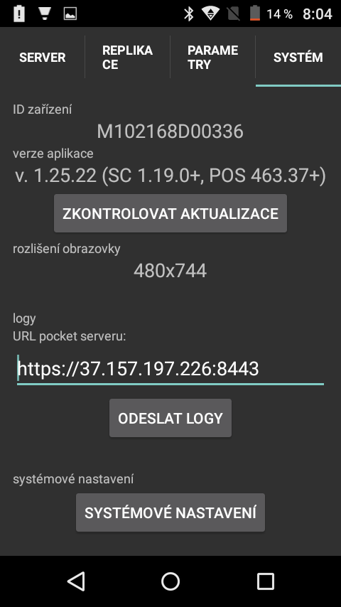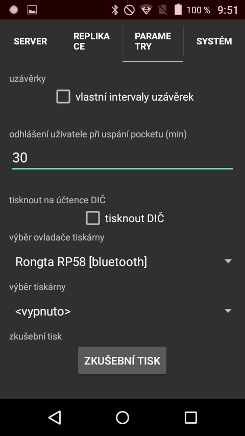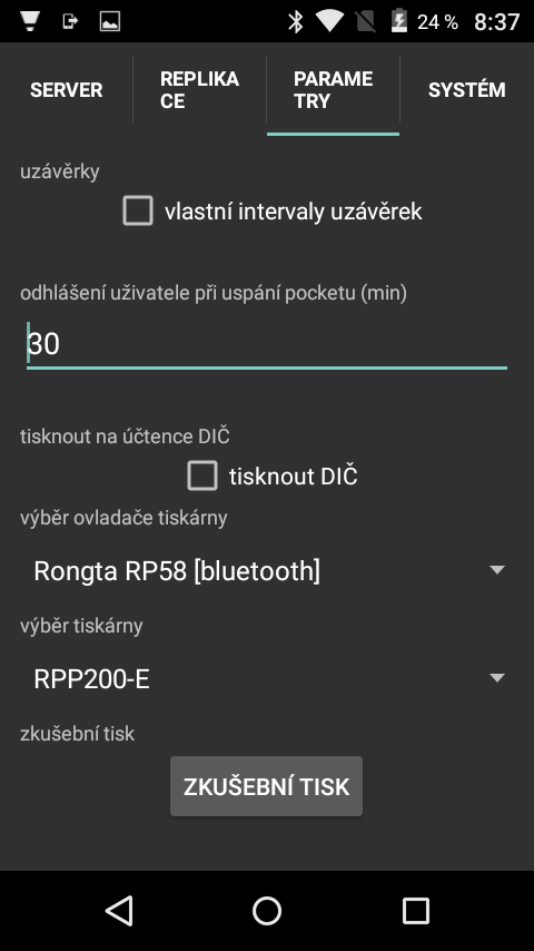 Pro konfiguraci tiskárny pracující s Pocketem (např. pro tisk účtenek na přenosné tiskárně) je potřeba v nastavení v horní liště přepnout na záložku s názvem Parametry v tom se vám ukáže tato obrazovka: