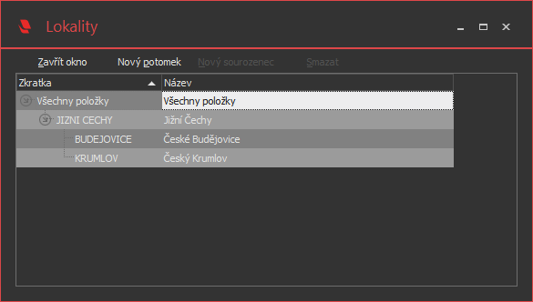 V druhém použitém náhledu (například Lokality) je stromová struktura vidět stále a zanoření prvků se řeší při jeho vytváření – vytváříme potomka či sourozence už existujícího prvku.