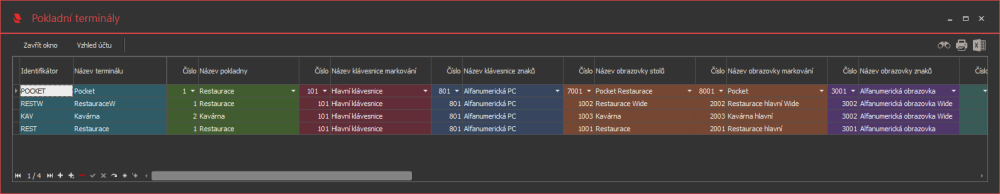 Nastavení chování jednotlivých pokladních terminálů. Vybíráme připojenou tiskárnu a použitou klávesnici, nastavujeme hlavičku a patičku účtu, přiřazujeme terminál pokladně, nastavujeme chování speciálních zařízení.