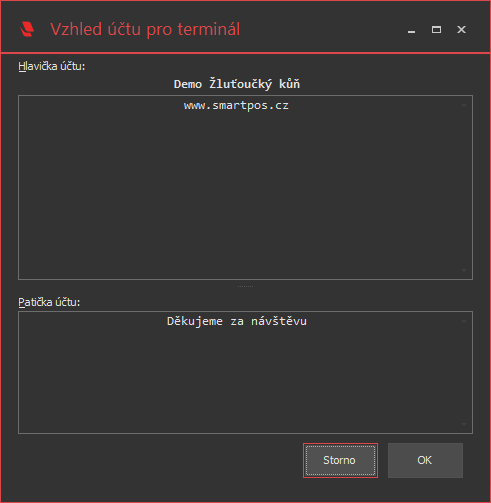 | Vzhled účtu | V hlavičce okna Terminály lze tlačítkem Vzhled účtu vyvolat okno pro zadání textu, který se bude tisknout do účtenky. |