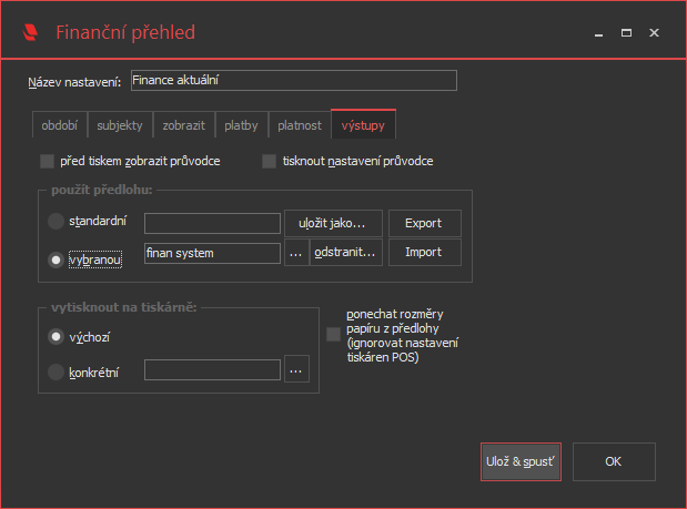 Pro uživatelský export a import, přejmenování a případně i smazání předlohy tiskové sestavy slouží záložka výstupy v průvodci sestavou. Na této záložce lze také definovat, zda se průvodce zobrazí před spuštěním sestavy (např. vhodné u vyhodnocovacích sestav typu Statistika prodeje), na kterou explicitně určenou tiskárnu se má sestava vytisknout (ignoruje nastavení tiskárny sestav a účtů v terminálu), případně zda ponechat explicitní nastavení rozměrů papíru z předlohy sestavy.