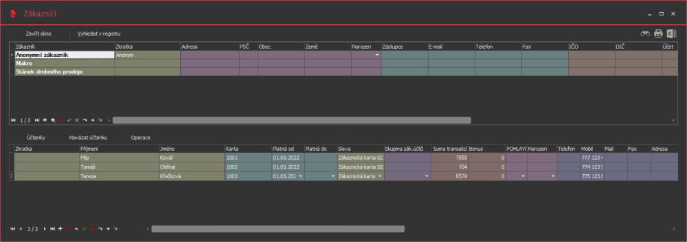 Formulář je rozdělen do dvou částí. V horní části formuláře jsou zobrazeni všichni existující zákazníci. V dolní části formuláře je zobrazován detailní panel zákaznického účtu vázanému ke kartě zákazníka vybraného v horní části formuláře. Detailní panel obsahuje také tlačítka Operace, Účtenky, Navázat účtenky (jejich funkčnost viz kapitola Zákaznické účty).